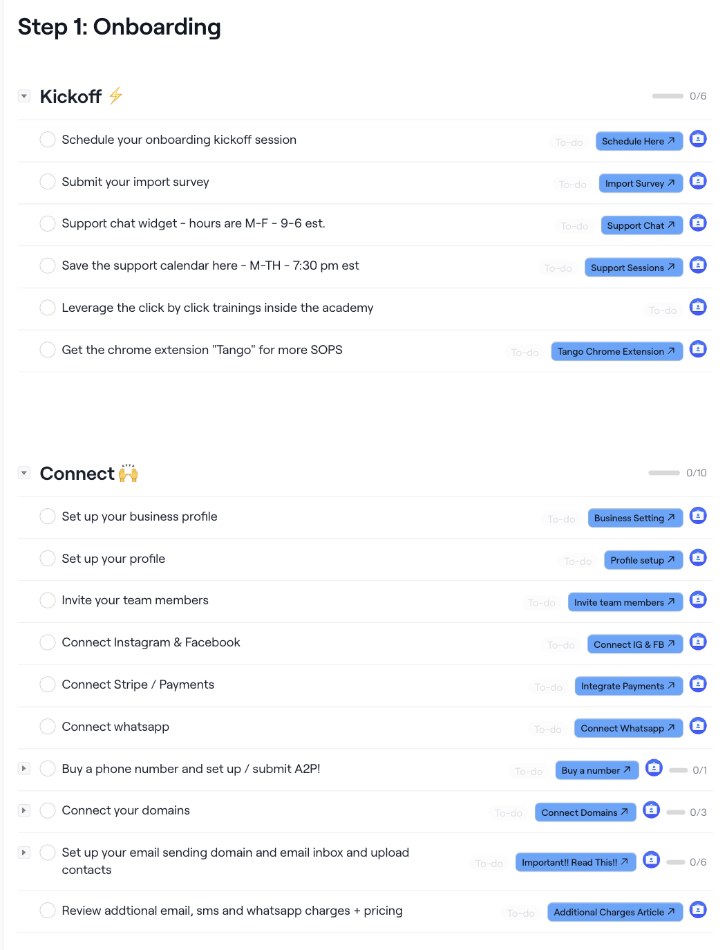 📚 Linked Resources: Access different articles, click-by-click demos, and training videos directly through the game plan. This is also covered in our onboarding call, where we introduce the game plans for the first time.
