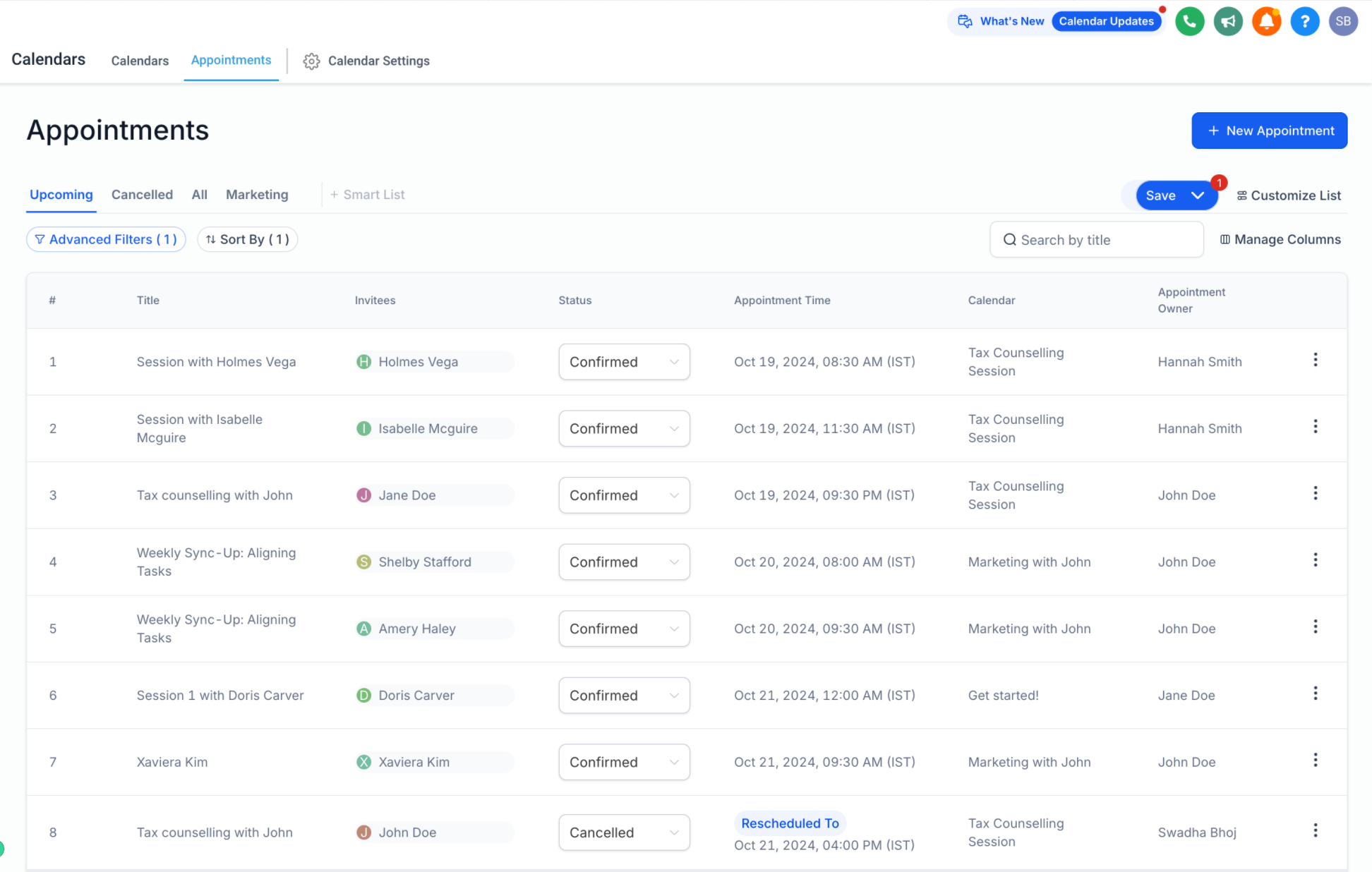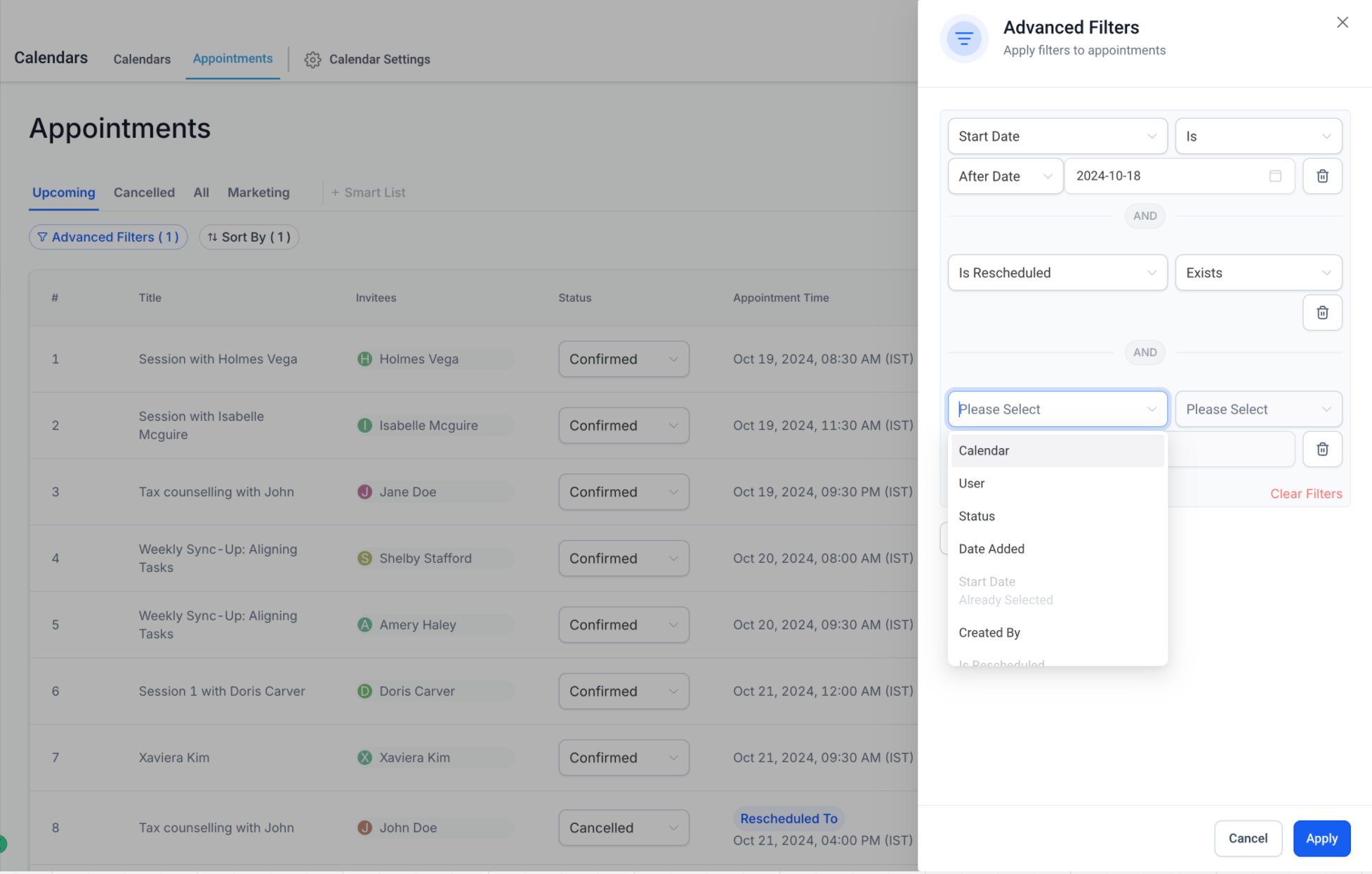 Filter appointments by calendars, users, status, creator, and whether the appointment is rescheduled. Use AND/OR logic to create complex filters that meet your specific needs.