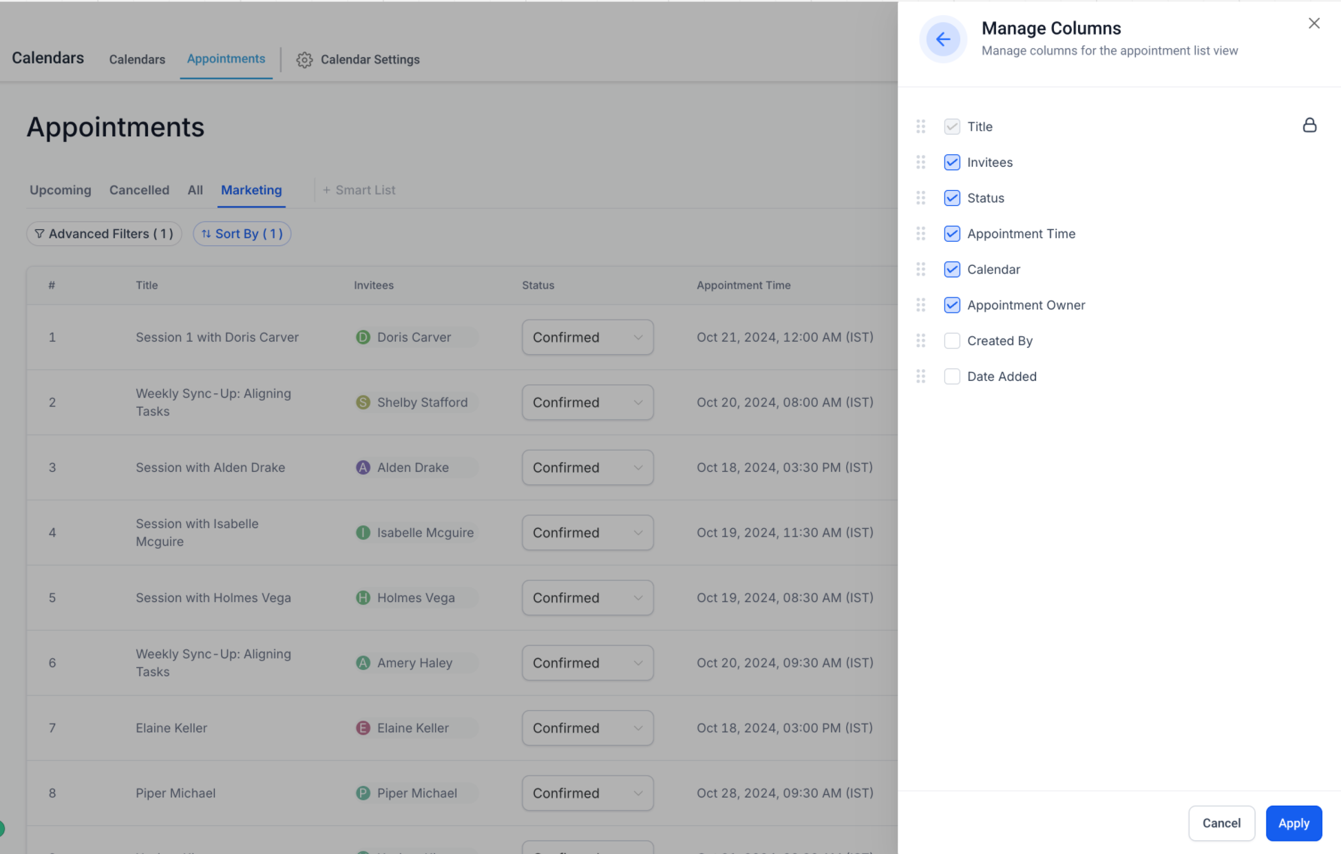 Customize which columns appear in your appointment list and rearrange them as per your preference. Add or remove columns with ease to tailor the view to your needs.